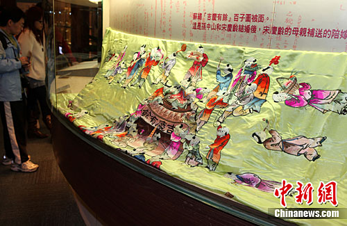 其中,北京宋慶齡故居館藏的56件文物系首次在臺展出。孫中山穿過的西服、用過的手杖、懷表、筷子、禮帽,簽署遺囑所用的鋼筆,以及宋慶齡的名片、手絹、旗袍等都是難得一見的文物。而孫中山與宋慶齡的結婚禮物毛瑟手槍、宋母補送的嫁妝蘇繡“吉慶有余”百子圖被面等,彌足珍貴。