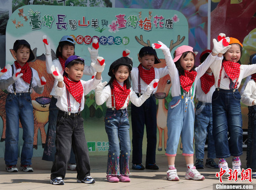 4月7日,臺北市立動物園為臺灣同胞回贈大陸同胞的長鬃山羊(“喜羊羊”和“樂羊羊”)和梅花鹿(“繁星”和“點點”)舉行祈福活動,它們即將在16日啟程赴山東劉公島。這場名為“永保安康——為長鬃山羊與梅花鹿祈福”的活動吸引了近百名幼兒園小朋友和小學生參加。圖為祈福儀式上,臺北小朋友跳起自編自演的動物舞蹈。路梅 攝