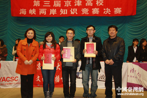 “你好臺(tái)灣”杯第三屆京津高校海峽兩岸知識(shí)大賽歷時(shí)一個(gè)多月,經(jīng)過(guò)激烈比賽,宣告圓滿閉幕。自2011年11月初初賽以來(lái),大賽共吸引了4000余兩岸青年學(xué)生參與其中。經(jīng)過(guò)多輪比賽,最終進(jìn)入決賽的七支隊(duì)伍分別是南開(kāi)大學(xué)兩岸交流協(xié)會(huì)、北京大學(xué)臺(tái)灣研究會(huì)、清華大學(xué)學(xué)生海峽兩岸交流協(xié)會(huì)、北京交通大學(xué)兩岸青年交流協(xié)會(huì)、北京林業(yè)大學(xué)閩臺(tái)文化傳播協(xié)會(huì)、中國(guó)人民大學(xué)港澳臺(tái)交流發(fā)展協(xié)會(huì)、北京師范大學(xué)“形勢(shì)與政策”小組。最終,中國(guó)人民大學(xué)港澳臺(tái)交流發(fā)展協(xié)會(huì)的選手憑借出色表現(xiàn)奪得了冠軍。(記者 郜利敏)