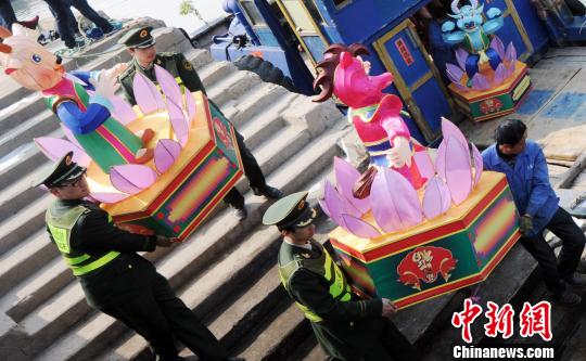 當(dāng)日,福州連江縣黃岐臺(tái)輪停泊點(diǎn)碼頭上,走馬燈、八駿圖、馬年特制花燈、媽祖女神燈、新春喜慶燈等已依次卸下車,擺放整齊。福州連江黃岐邊防派出所官兵,正協(xié)助工作人員將贈(zèng)送馬祖同胞的包括馬年生肖花燈在內(nèi)的中華傳統(tǒng)文化燈(十二生肖),搬運(yùn)裝船。