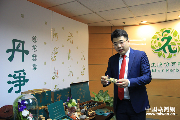 在2016天津臺(tái)灣名品博覽會(huì)即將舉行之際,“尋跡臺(tái)灣名品”媒體采訪團(tuán)于6月14日至19日走進(jìn)臺(tái)灣,探訪臺(tái)灣名品企業(yè)。圖為臺(tái)灣鈞生股份有限公司董事總經(jīng)理趙國(guó)鈞介紹該公司生產(chǎn)的養(yǎng)生產(chǎn)品。(中國(guó)臺(tái)灣網(wǎng) 扶海濤 攝)