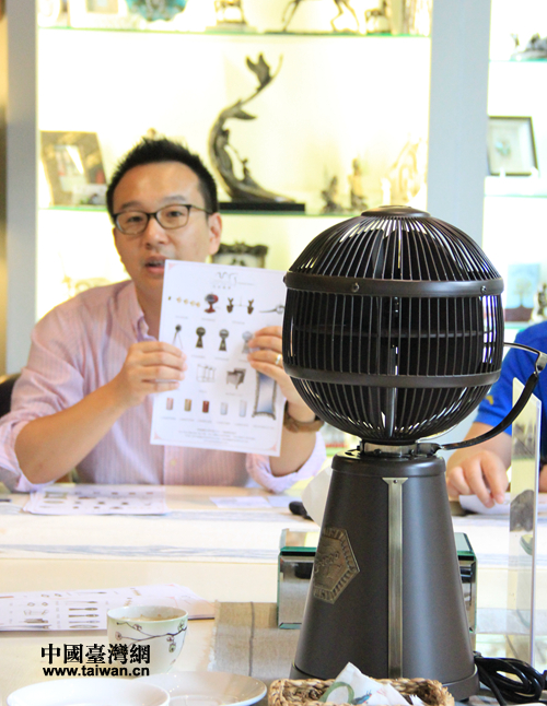 在2016天津臺(tái)灣名品博覽會(huì)即將舉行之際,“尋跡臺(tái)灣名品”媒體采訪團(tuán)于6月14日至19日走進(jìn)臺(tái)灣,探訪臺(tái)灣名品企業(yè)。圖為美砌國(guó)際企業(yè)有限公司負(fù)責(zé)人許家祥介紹該公司新設(shè)計(jì)的桌上型電風(fēng)扇。