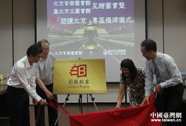 北京文化局副局長呂先富(左一)、北京海峽兩岸民間交流促進會副會長黃塞溪(左二)、臺北市文化局副局長李麗珠(右二)、臺北市立圖書館館長洪世昌(右一)共同為“閱讀北京”專區揭牌。(中國臺灣網 王思羽 攝)