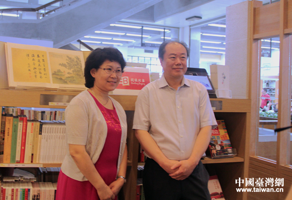 北京海峽兩岸民間交流促進會副會長黃塞溪(左)、北京首都圖書館副館長肖維平(右)在“閱讀北京”專區合影。(中國臺灣網 王思羽 攝)