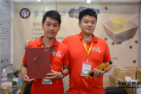 許登輝(右)此次主要來推介自己生產的苦茶油。(中國臺灣網 李寧 攝)