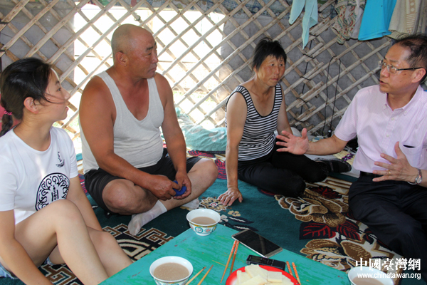 滕鴻年來到達(dá)日丹(左一)家蒙古包,與其父母話家常。(中國(guó)臺(tái)灣網(wǎng) 王思羽 攝)