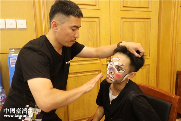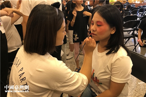 京劇老師為臺灣青年化妝。(中國臺灣網 趙苗青 攝)