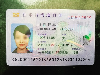 據(jù)了解,電子往來臺(tái)灣通行證為參照有關(guān)國際標(biāo)準(zhǔn)設(shè)計(jì)制作的卡式證件,內(nèi)嵌非接觸式集成電路芯片。前往臺(tái)灣簽注不再采取貼紙的方式,而是直接打印在證件背面,并可重復(fù)擦寫。成人電子往來臺(tái)灣通行證有效期延長為10年,對(duì)未滿16周歲的居民仍簽發(fā)5年有效通行證。