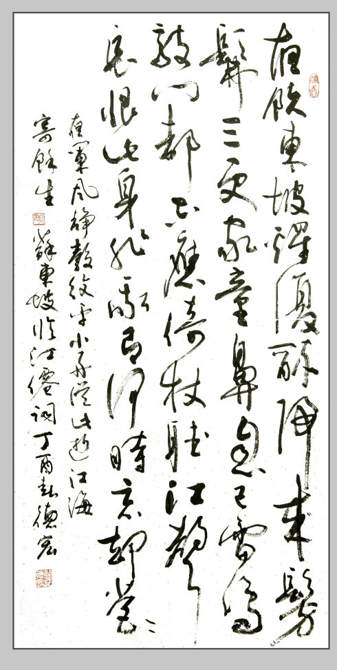 龔德宏將軍以蒼勁的行草,書(shū)寫(xiě)了東坡《臨江仙·夜飲東坡醒復(fù)醉》全文,表達(dá)著不被困難和痛苦所屈服,以超人的意志從大自然中感悟人生哲理、尋求美好享受的曠達(dá)襟懷。