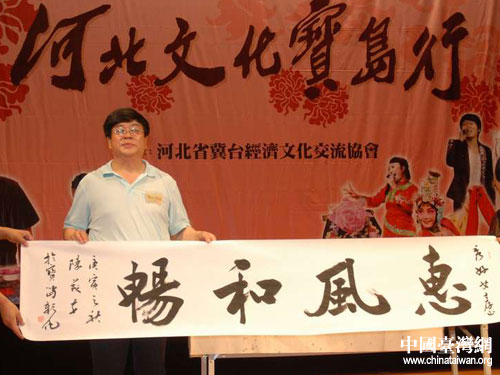 河北省書協副主席陳茂才的書法表演也受到了觀眾的歡迎,尤其是有幸得到他墨寶的觀眾更是喜不自勝。來自彰化的許秀女得到了陳茂才的“惠風和暢”書法,非常高興地表示回去后一定裝裱起來,好好收藏。在現場,演出小分隊還向觀眾贈送了武強年畫、蘆葦畫等。