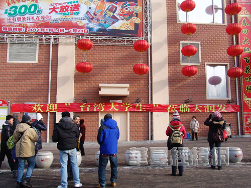 1月20日,參加2011中華文化研習營——冰雪龍江行的臺灣青年學生參觀在哈爾濱臺資企業。圖為超市掛出寫有“歡迎臺灣大學生 蒞臨”的橫幅。黃楊 攝