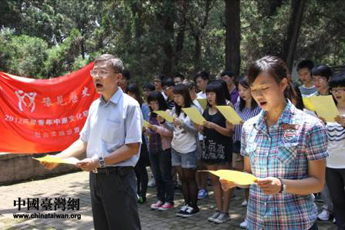 中國臺(tái)灣網(wǎng)7月12日平頂山消息 “大江東去,浪淘盡,千古風(fēng)流人物,故壘西邊,人道是,三國周郎赤壁,……”這不是教室學(xué)生們的讀書聲音,它是兩岸青年學(xué)子在“三蘇墳”前齊誦蘇東坡著名的《念奴嬌·赤壁懷古》。7月11日,2012年“豫見歷史——兩岸青年中原文化研習(xí)營社會(huì)實(shí)踐分營”一行走進(jìn)平頂山郟縣三蘇園,在這里舉行了一場(chǎng)別具風(fēng)格的兩岸青年文化交流活動(dòng)。