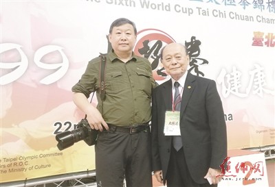 在比賽現(xiàn)場(chǎng)的主席臺(tái)旁,記者試圖采訪了解這次比賽的基本情況,工作人員熱情地接待并把我介紹給在主席臺(tái)就座的一位長(zhǎng)者。沒(méi)想到這位精神矍鑠的老人竟是臺(tái)灣地區(qū)太極拳總會(huì)理事長(zhǎng)黃裕盛,記者激動(dòng)地掏出名片自我介紹。