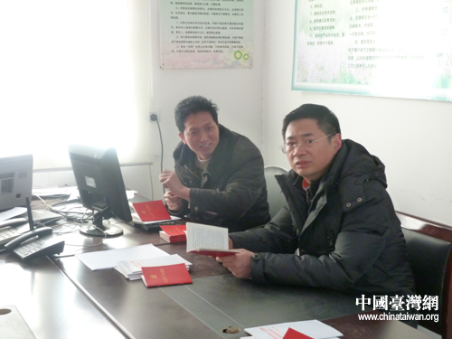 趙文忠與天子溝村支部書記陳圣強(qiáng)一起學(xué)習(xí)黨章。(襄陽(yáng)市臺(tái)辦 崔有理 攝)