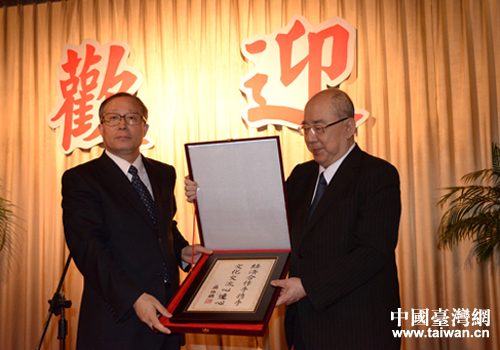 5月28日,在圓山飯店與吳伯雄先生互贈禮品。(圖片來源:湖北省臺辦)