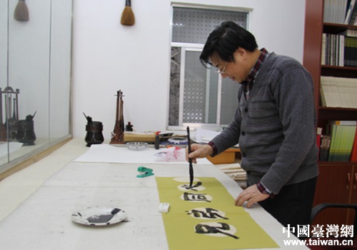 中國臺灣網11月22日荊門訊 11月17日,中國書法家協會會員、荊門市著名書法家彭金淋得知桃園市龜山區大同里參訪團一行來到荊門,與掇刀區團林鋪鎮大同村開展同名兄弟村里交流活動,當即欣然揮毫潑墨,為同名兄弟村里題寫了“兄弟同心手足情深”的條幅,令參訪團臺胞感動不已。