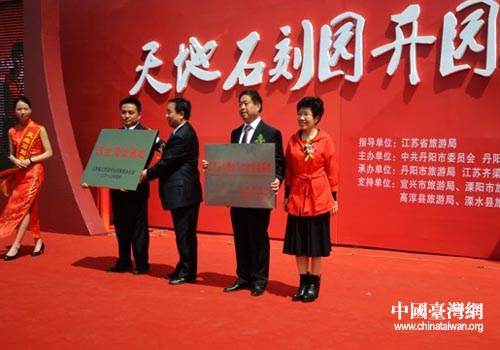 中國(guó)臺(tái)灣網(wǎng)4月25日丹陽(yáng)消息 4月23日,江蘇文化科技產(chǎn)業(yè)園一期核心工程項(xiàng)目——丹陽(yáng)天地石刻園開(kāi)園儀式暨江蘇首家“蘇臺(tái)交流基地”掛牌儀式在丹陽(yáng)隆重舉行。中宣部秘書(shū)長(zhǎng)官景輝,江蘇省副省長(zhǎng)許津榮,鎮(zhèn)江市委書(shū)記張敬華,市委常委、丹陽(yáng)市委書(shū)記李茂川等共同為天地石刻園啟動(dòng)開(kāi)園按鈕。江蘇省臺(tái)辦副主任石細(xì)云代表省臺(tái)辦授予石刻園“蘇臺(tái)交流基地”牌匾。至此,江蘇首家“蘇臺(tái)交流基地”正式掛牌。
