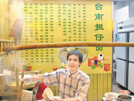 56歲在寶島夜市賣臺(tái)南擔(dān)仔面的陳國(guó)財(cái)說,他在臺(tái)南的擔(dān)仔面很早以前就收攤了,到北京是來開創(chuàng)第二春,擔(dān)仔面一碗賣12元人民幣,試賣期間,一天都賣一百多碗。為了保持原汁原味,醬料都是臺(tái)灣運(yùn)來的,他相信“臺(tái)灣的口味”在北京一定會(huì)受歡迎。