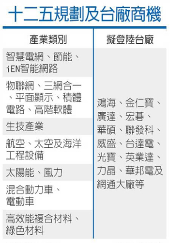 臺(tái)媒總結(jié)“十二五”規(guī)劃給臺(tái)商帶來(lái)的商機(jī)。 來(lái)源:《工商時(shí)報(bào)》