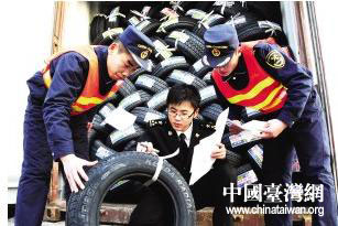 太倉海關關員對出口臺灣的輪胎進行現場檢驗。圖片來源:太倉臺辦