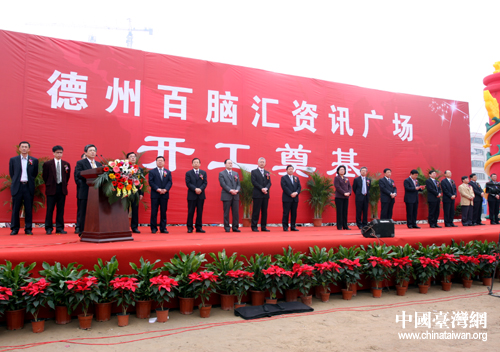 中國臺灣網4月23日德州消息 4月21日,由臺灣藍天集團投資的德州百腦匯資訊廣場項目開工奠基儀式在山東德州隆重舉行。山東省臺辦副主任曹曉武,臺灣藍天集團副董事長、總經理、百腦匯總裁蔡明賢,德州市領導吳翠云、陳先運、滿春重、韓建亭、翟長生,市臺辦主任邢躍升出席儀式。