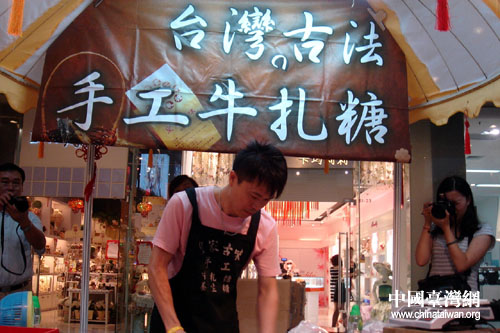 在位于澳門(mén)路百麗廣場(chǎng)的巡展現(xiàn)場(chǎng),60個(gè)統(tǒng)一制式的黃白相間的小攤位顯得別有韻味,每個(gè)展位面積為6平方米。參展的商家以日常生活涉及的飲食、起居小型消費(fèi)品為主,打造體驗(yàn)臺(tái)灣生活的概念。其中,臺(tái)灣特色小吃、飲食最受市民的歡迎,雖然價(jià)格不算便宜,但還是有很多人逛了一圈下來(lái)后斬獲不少“戰(zhàn)利品”。“這是臺(tái)灣正宗的,不摻假,買回家嘗嘗。”