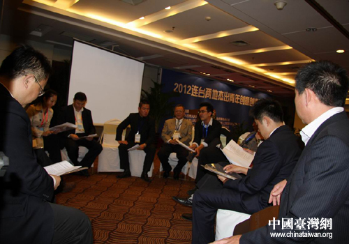 參加2012連臺(tái)兩地杰出青年創(chuàng)意創(chuàng)業(yè)論壇的與會(huì)人員交流座談。(圖片來(lái)源:大連市臺(tái)辦)