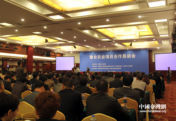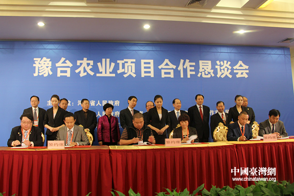 2013豫臺項目合作懇談會12日下午在河南鄭州舉行。此次懇談會共簽署了10個農業合作項目,項目總投資額38.85億元人民幣,將大力推動豫臺農業的交流與合作,實現共贏。(中國臺灣網 普燕攝)