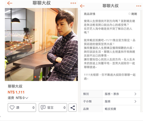 而據(jù)香港《明報》網(wǎng)站報道,來自新加坡的手機App“蝦皮拍賣”也趁“光棍節(jié)”在臺灣等地推出限時拍賣:“聊聊大叔”服務(wù),由官方遴選擁有豐富人生歷練及懂得傾聽的優(yōu)質(zhì)型男大叔,與下標(biāo)者聊聊天,讓單身者光棍節(jié)也不孤單。