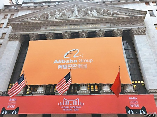 美東時間11月11日早晨,美國紐約交易所外墻掛起橙色阿里巴巴標(biāo)志和紅色天貓橫幅,向雙十一全球網(wǎng)購節(jié)致意。 圖/取自天貓微博