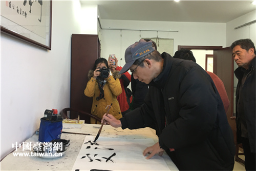 在核桃園社區(qū),高雄本安里里長林辛福練書法。(中國臺灣網(wǎng) 段雯婷 攝)