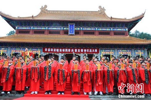 “辛卯年清明海峽兩岸共祭炎帝神農氏大典”4月3日在中華始祖炎帝安寢地湖南株洲炎帝陵舉行,參加第二屆“在臺湘籍后裔湖南行”活動的臺灣鄉親及社會各界人士共200多人祭拜炎帝神農氏。圖為千人頌唱《祭炎帝》。中新社發劉柱 攝