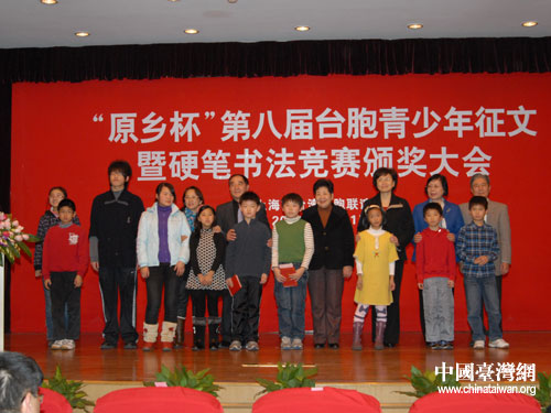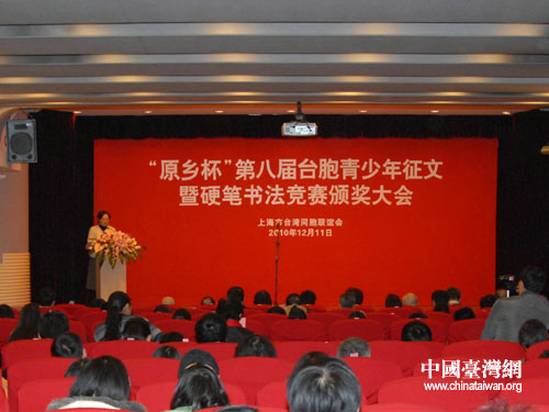中國臺灣網12月14日上海消息 日前,由上海市臺灣同胞聯誼會主辦的“原鄉杯”第八屆臺胞青少年征文硬筆書法競賽頒獎暨上海市臺聯獎學金頒發大會在文新報業大廈舉行,獲獎學生及老師家長、各界領導嘉賓約300人分享了臺胞青少年成功的喜悅。中共中央候補委員、全國臺聯副會長、上海市臺聯會長林明月,市委統戰部副部長丁志堅,市臺辦副主任趙雅君等領導出席頒獎大會并為獲獎學生頒獎。