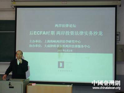 中國臺灣網3月9日上海消息 由上海海峽兩岸法學研究中心舉辦的首期“后ECFA時期兩岸投資法律實務沙龍”日前在華東師范大學舉行。上海市及各區縣臺辦相關負責人、法學界人士、各商會相關負責人、臺商高管、擬赴臺投資的陸資企業高管等80余人參加了活動。