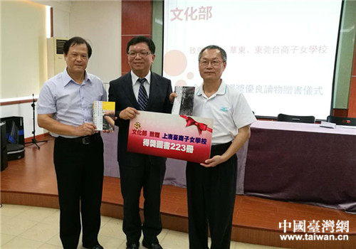 配合這一次書展,文化部也特別關注在大陸的臺商學校,帶來金鼎獎及金漫獎優質書籍頒贈給三所臺商學校。8月19日上午,舉行捐贈儀式。上海臺商子女學校黃棋楓校長、華東臺商子女學校王先念校長、東莞臺商子弟學校王炎磷校長接受頒贈。三所臺商學校校長對文化部表達最深摯的感謝,許諾將所頒贈書籍放置圖書館提供借閱,并加強推廣閱讀活動;三所臺校的師生們將會是這次贈書的最佳受益者。