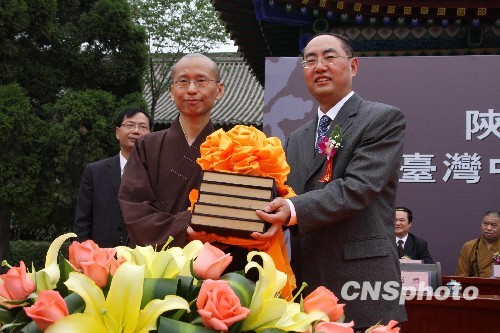 惟覺長老此次是專程來此間出席碑石拓本贈送儀式的。從2009年底開始,西安碑林博物館對碑林藏石進行拓印,共向臺灣中臺禪寺贈送藏石拓本528種、墓志拓本745種。囊括了該館珍藏的歷代著名碑刻,涉及歷史、經濟、文化、宗教、軍事、藝術、地理等諸多領域。其數目之多、級別之高,均創碑林建館史上的贈品之最。