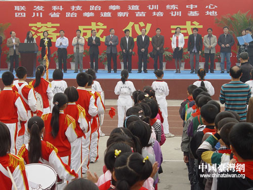 綿竹市富新鎮黨政領導以及富發新建小學全體師生參加落成儀式,四川省跆拳道運動中心跆拳道表演隊作了跆拳道表演。(中國臺灣網德陽市臺辦通訊員甘和林)