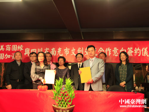 南充市文化創(chuàng)意訪問團與臺灣“美商圓緣文化創(chuàng)意公司”簽約。圖片來源:南充市臺辦