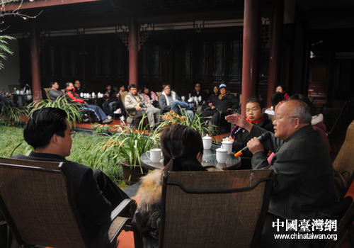 四川知名學(xué)者袁庭棟教授(中)向臺(tái)灣中華聯(lián)合青年議事協(xié)會(huì)參訪團(tuán)一行作巴蜀文化講座。(圖片來(lái)源:四川省臺(tái)辦)
