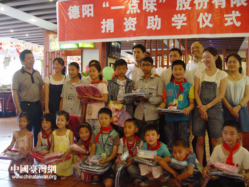 中國臺灣網6月6日德陽消息 日前,德陽市臺資企業“一點味”股份有限公司在“一點味”餐館舉行慶“六一”獻愛心捐資助學儀式。德陽市臺辦和德陽“一點味”公司的負責人一起,向旌陽區城北街道辦新河街社區的14名貧困學生每人贈送了500元助學金和書包、文具等學習用具。