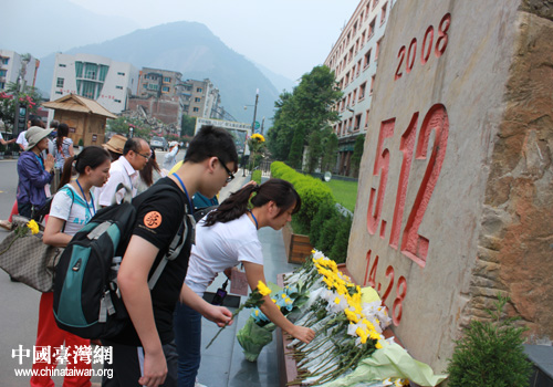 參訪團一行為北川地震遇難同胞敬獻鮮花寄托哀思。(圖片來源:綿陽市臺辦)