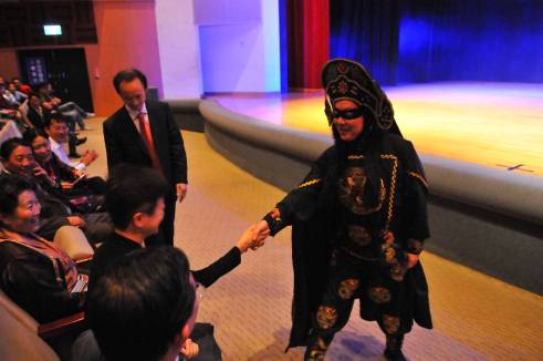 川劇變臉演員李艷冬與臺下觀眾互動。