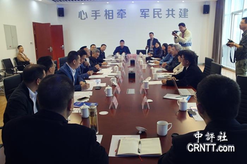 中評四川走親采訪團與中共綿竹市委員會常委顏超、綿陽科技城管委會副主任胡精、綿陽市臺辦主任陳福林等人舉行座談(中評社 蘭忠偉攝)