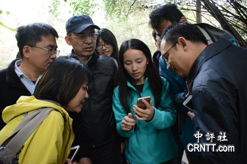 中評(píng)社采訪團(tuán)在成都大熊貓繁殖研究基地,圍著解說員看繁殖紀(jì)錄。(中評(píng)社 趙家麟攝)
