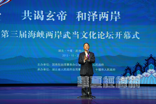 華夏經緯網10月26日訊:25日晚,第三屆海峽兩岸武當文化論壇在武當山太極劇場舉行開幕儀式。出席開幕式的重要嘉賓有海峽兩岸關系協(xié)會副會長蔣耀平、臺灣海峽交流基金會副董事長高孔廉、湖北省第十屆政協(xié)副主席陳柏槐、中共十堰市委書記周霽。