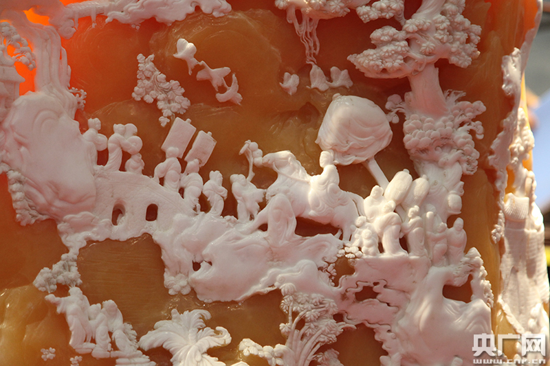 名為“走馬觀花”的壽山石工藝雕是臺(tái)灣雕刻家陳閩的作品,采用金田黃玉石雕刻而成。正濟(jì)藝術(shù)館的展商介紹雕刻這樣一件作品要半年時(shí)間,目前售價(jià)在168萬元。