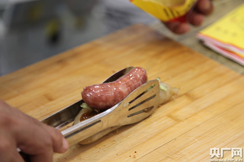 大腸包小腸:糯米腸包肉腸。
