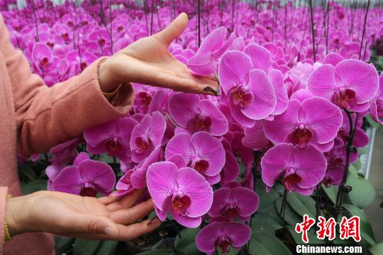 “蘭花花期長,一般能有三個月,但是在貴州遵義,氣溫適宜,花期基本能延長近6個月!奔夹g總監何立紅高興的告訴記者。站在成品區的大棚里,以經典玫紅色為主體的蝴蝶蘭競相怒放。