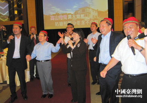 中國臺灣網(wǎng)8月24日嘉義消息 8月23日,在位于阿里山腳下的嘉義市耐斯王子大酒店舉行的歡迎午宴上,中國國民黨副主席、嘉義市長黃敏惠邀請到訪的江西省長鹿心社一行攜手共唱臺灣著名歌曲《阿里山的姑娘》,充分展示出兩岸同胞的深情厚誼。(中國臺灣網(wǎng)、江西省臺辦聯(lián)合報道)