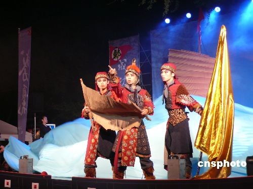 四月二十九日晚,臺(tái)灣鄭成功文化節(jié)在臺(tái)南延平郡王祠開幕。圖為臺(tái)灣東方藝術(shù)團(tuán)呈現(xiàn)鄭成功大航海時(shí)代的偉大歷史。“鄭成功文化節(jié)”是與媽祖文化節(jié)齊名的臺(tái)灣兩大文化盛事之一,迄今已進(jìn)入第八個(gè)年頭。二00九年鄭成功文化節(jié)的主題是“成功領(lǐng)航”。 中新社發(fā) 鄧敏 攝